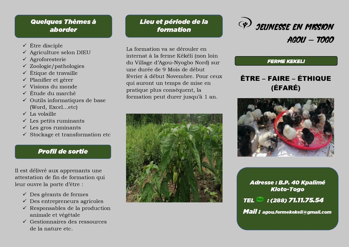 Quelques thèmes : être disciple - l'agriculture selon Dieu - l'agroforesterie - la zoologie - les pathologies - l'étique de travaille - planifier et gérer - la visions du monde - l'étude du marché - les outils informatiques de base - le stockage et la transformation, etc.